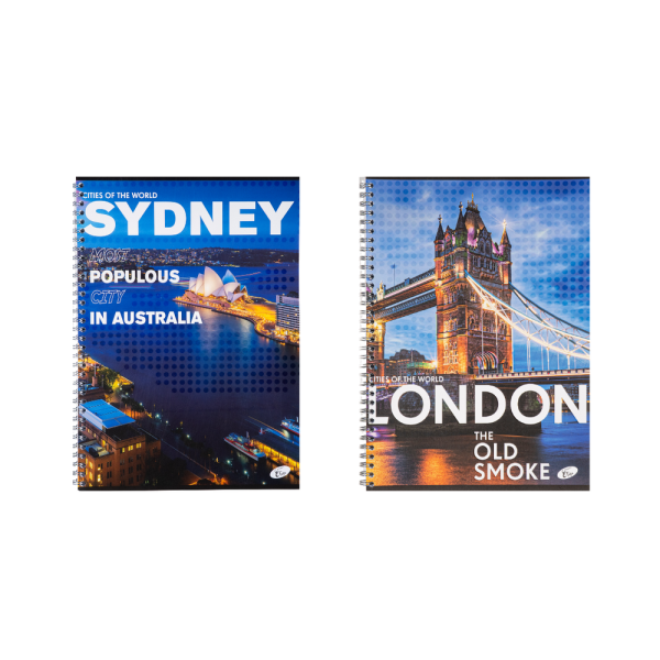 Caiete A4 cu imagini spectaculoase din marile orașe ale lumii, perfecte pentru școală sau birou. Coperta din carton gros de