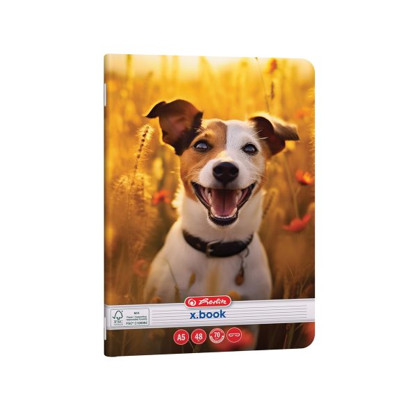 Caiet, format A5, coperti din carton dublu cretat, lucios, colturi rotunjite, hartie 70 g/mp FSC Mix, 48 file, dictando, capsat,