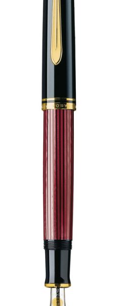 STILOU SOUVERAN M600 F,PENITA AUR 14K,ACCESORII PLACATE CU AUR,CORP NEGRU-ROSU