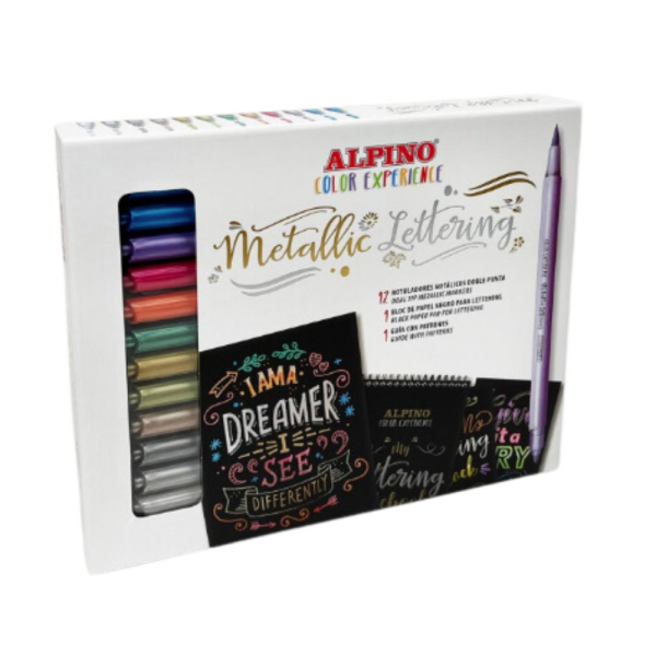 Setul de caligrafie ALPINO Color Experience include 12 markere metalice cu doua capete, perfect pentru a adauga un efect stralucitor