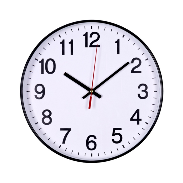 Ceas de perete Cu un cadran rotund alb, inconjurat de o rama si protejat de un geam din plastic Design