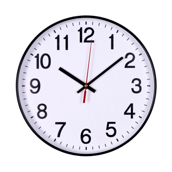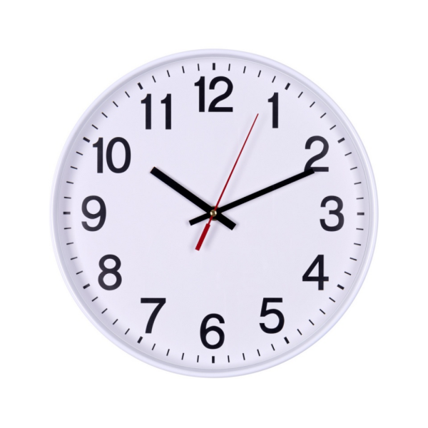 Ceas de perete Cu un cadran rotund alb, inconjurat de o rama si protejat de un geam din plastic Design