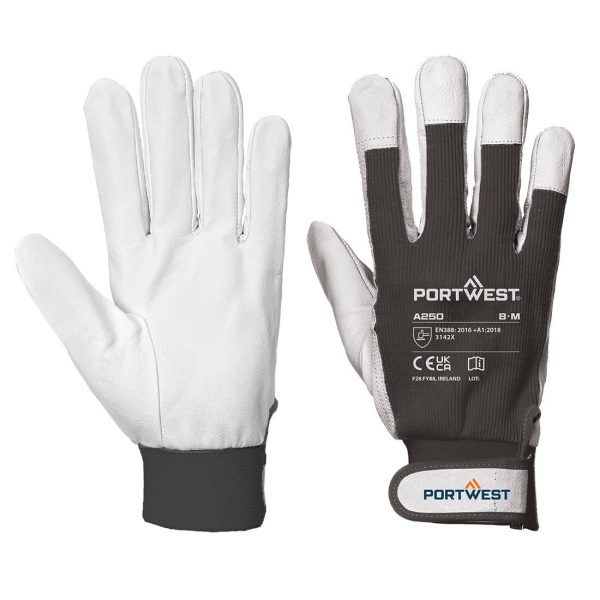 Produs rezistent, confectionat din piele texturata de porcina cu fixare cu arici, partea dorsala din bumbac si varful degetelor intarit.