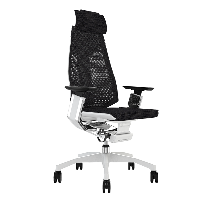 Scaun ergonomic rotativ, mecanism sincron, reglaj lombar (adâncime & înălțime), bază piramidală ALU, spătar plasă neagră, șezut tapițat material textil culoare neagră, reglabil pe înălțime, tetieră, brațe reglabile incluse.